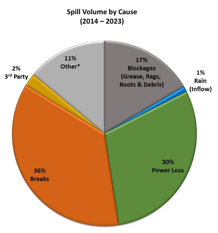 Between 2014 and 2023, only 6% of overflows were attributed to infiltration and inflow (I&I), which is notably lower than many other cities. Infiltration is when groundwater or rainfall seeps into the sewer system. Inflow is a more direct connection of surface water or rainfall runoff into openings in the system, such as missing (or intentionally removed) manhole and cleanout covers.